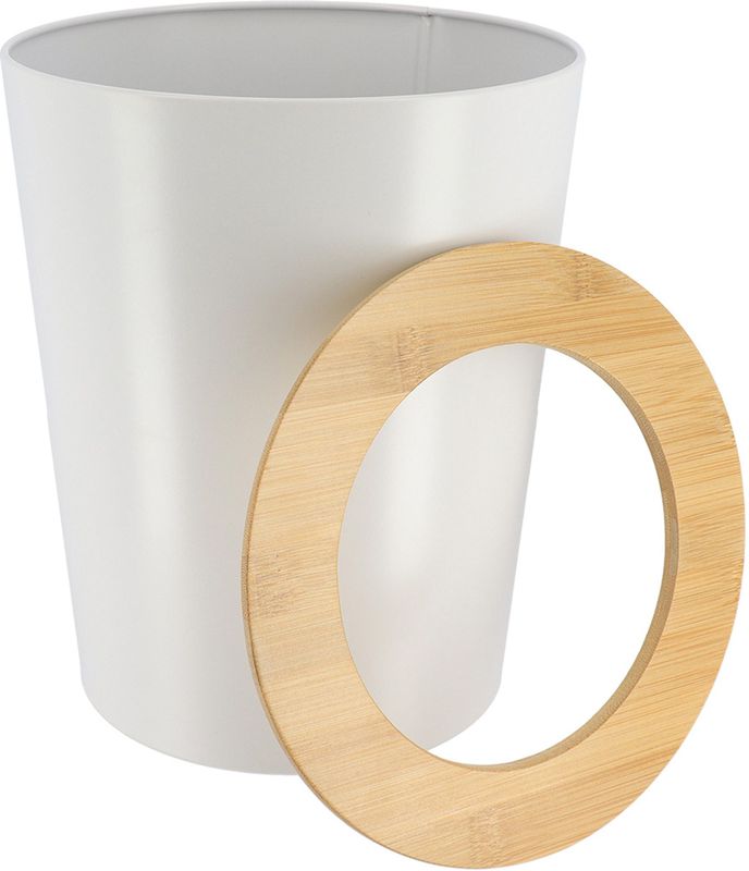 Metalen afvalemmer in wit met open bamboe deksel/rand. Stijlvol, hygiënisch en ideaal voor badkamer, toilet of slaapkamer.D.20cm x 25cm