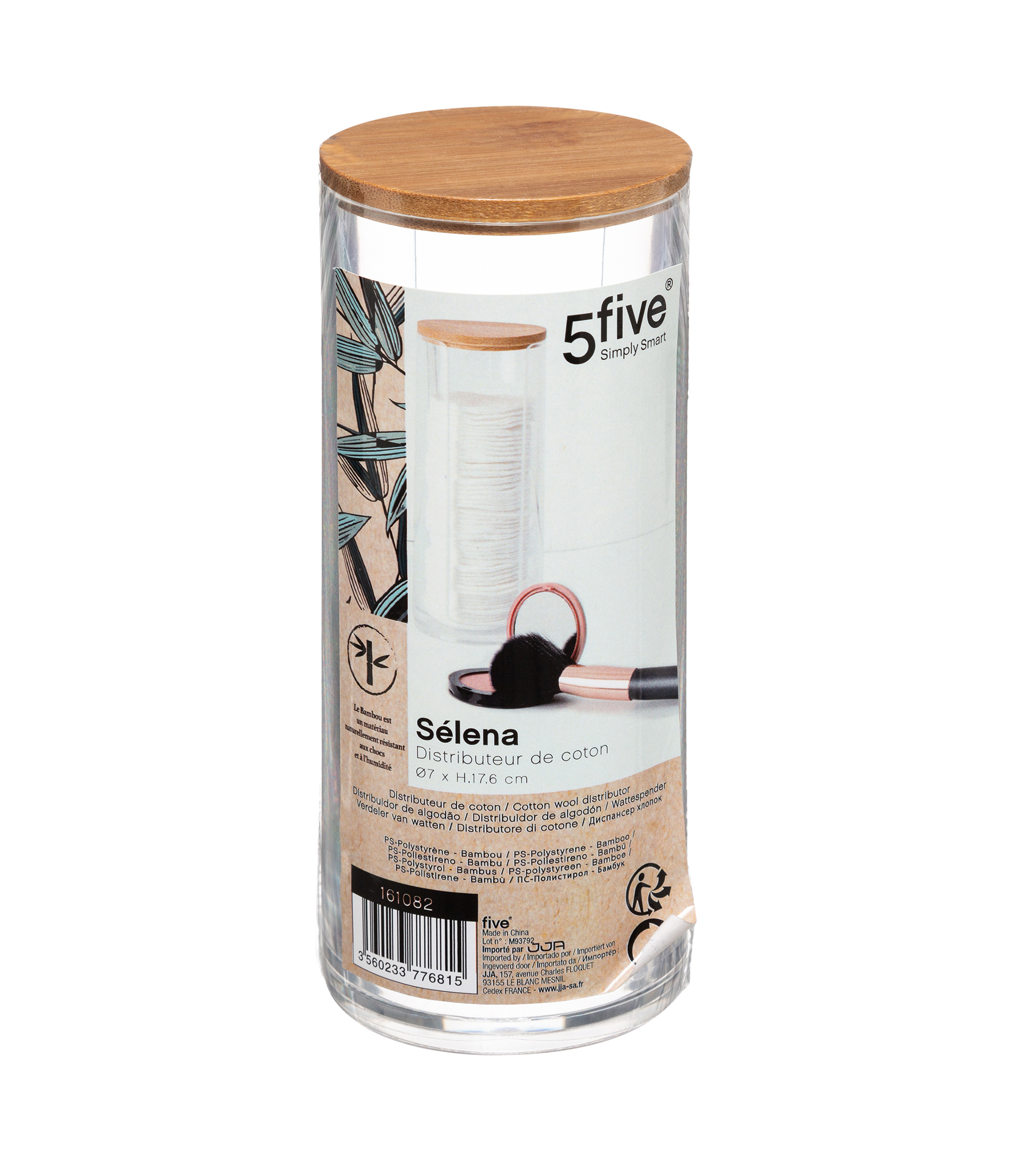 Transparante wattenschijfjeshouder met opening en bamboe deksel “Selena” ø7×17,8cm