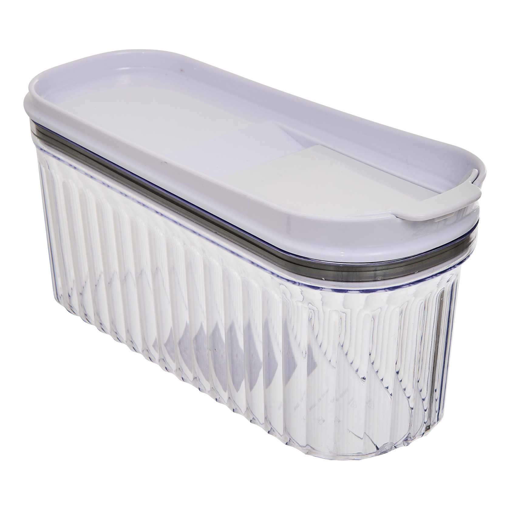 Voorraadbus kunststof transparant-wit 1,5L is ideaal voor het overzichtelijk bewaren van voedsel in je keuken. Bovendien zorgt het slimme ontwerp ervoor dat ingrediënten langer vers blijven. Daardoor blijft je voorraad netjes en goed georganiseerd, terwijl je eenvoudig ziet wat erin zit.
