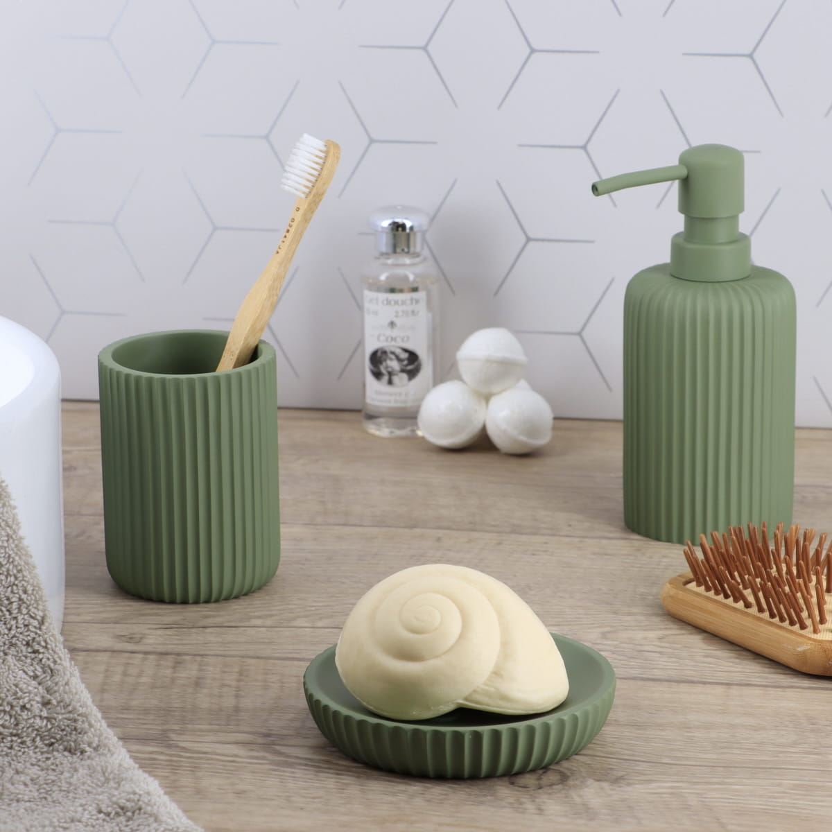 RoStijlvol kakigroene zeepbakje met geribbelde rand en antislipnoppen. Ideaal voor een opgeruimde, moderne en hygiƫnische badkamer